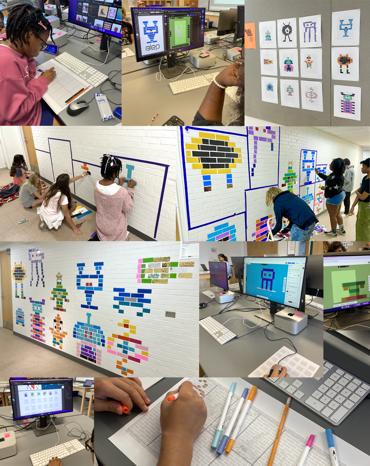 WEEK 2 / 8-bit Creature Design Designers use pixel art for various reasons, often stemming from its unique aesthetic, technical accessibility, and nostalgic appeal. Pixel art is easy to create and animate and it can be a powerful tool for conveying information simply and efficiently. This week-long assignment helps students understand how designers work with scale and color to communicate an idea. They also used both analog and digital tools to create their designs. We were inspired by our Sci-Fi camp theme.