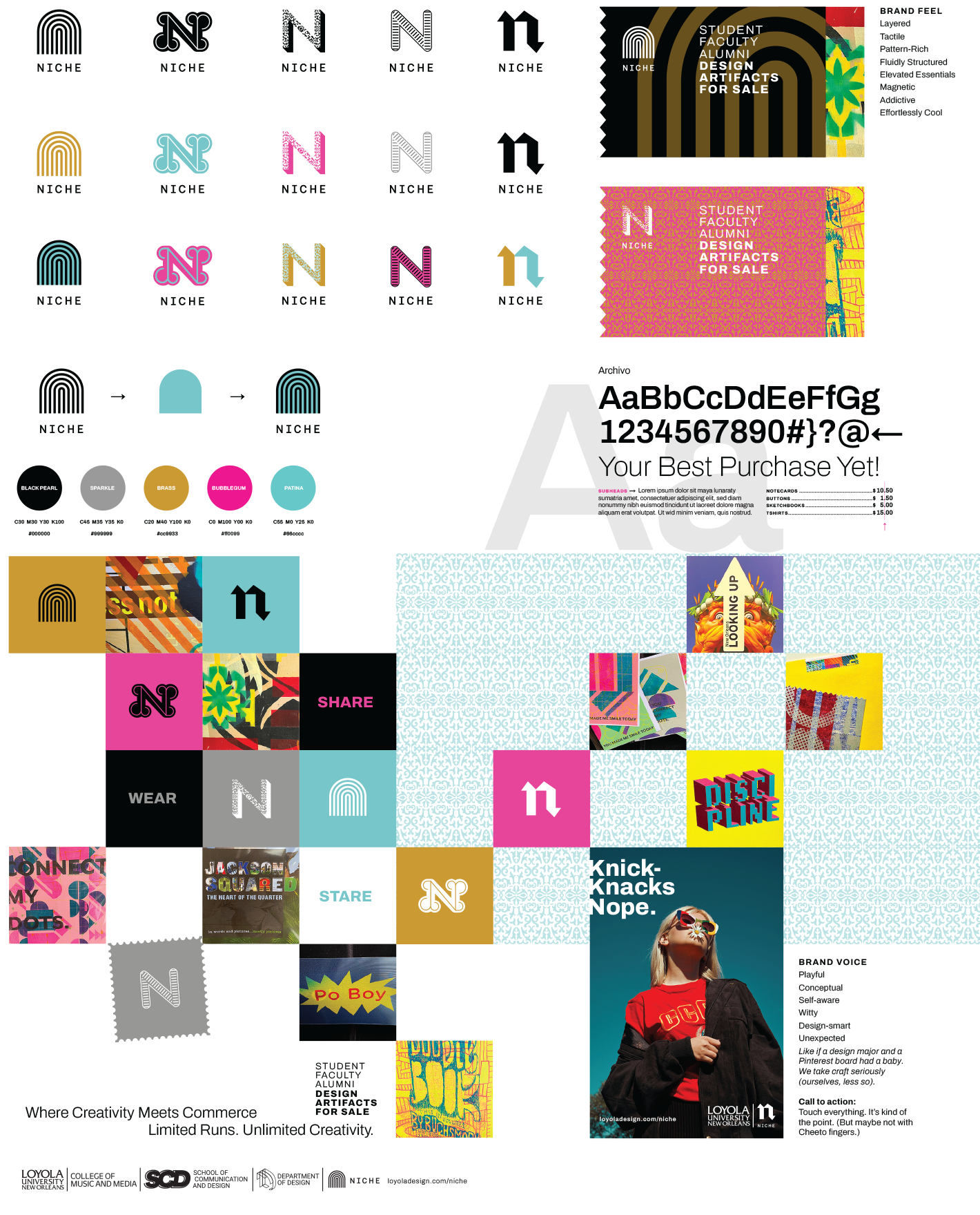 Offered through the Department of Design, Niche is a hands-on course that immerses students in the full experience of designing for a real retail environment. The course explores key aspects of retail design including branding, point-of-purchase displays, visual merchandising, in-store promotions, customer experience and new product development. I worked with our department chair to create a unique and fluid identity system that includes some guardrails to work within while allowing the system to evolve over time. I also added some brand language they can have fun with.