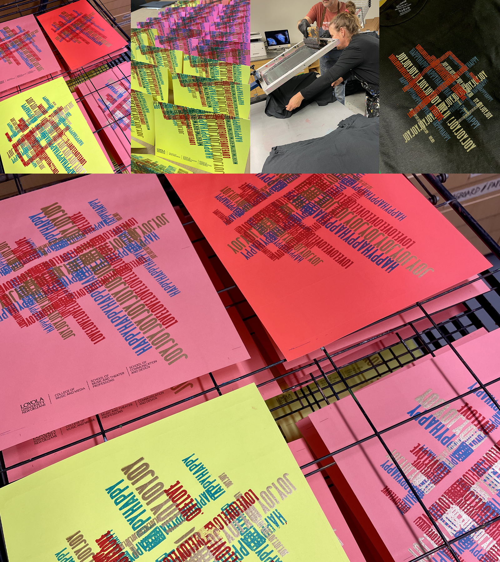 I designed the 2024-25 holiday card for the dean using non-denominational words and phrases overprinted in holiday colors using our screen printing facilities. The design was used on shirts and totes, as well.