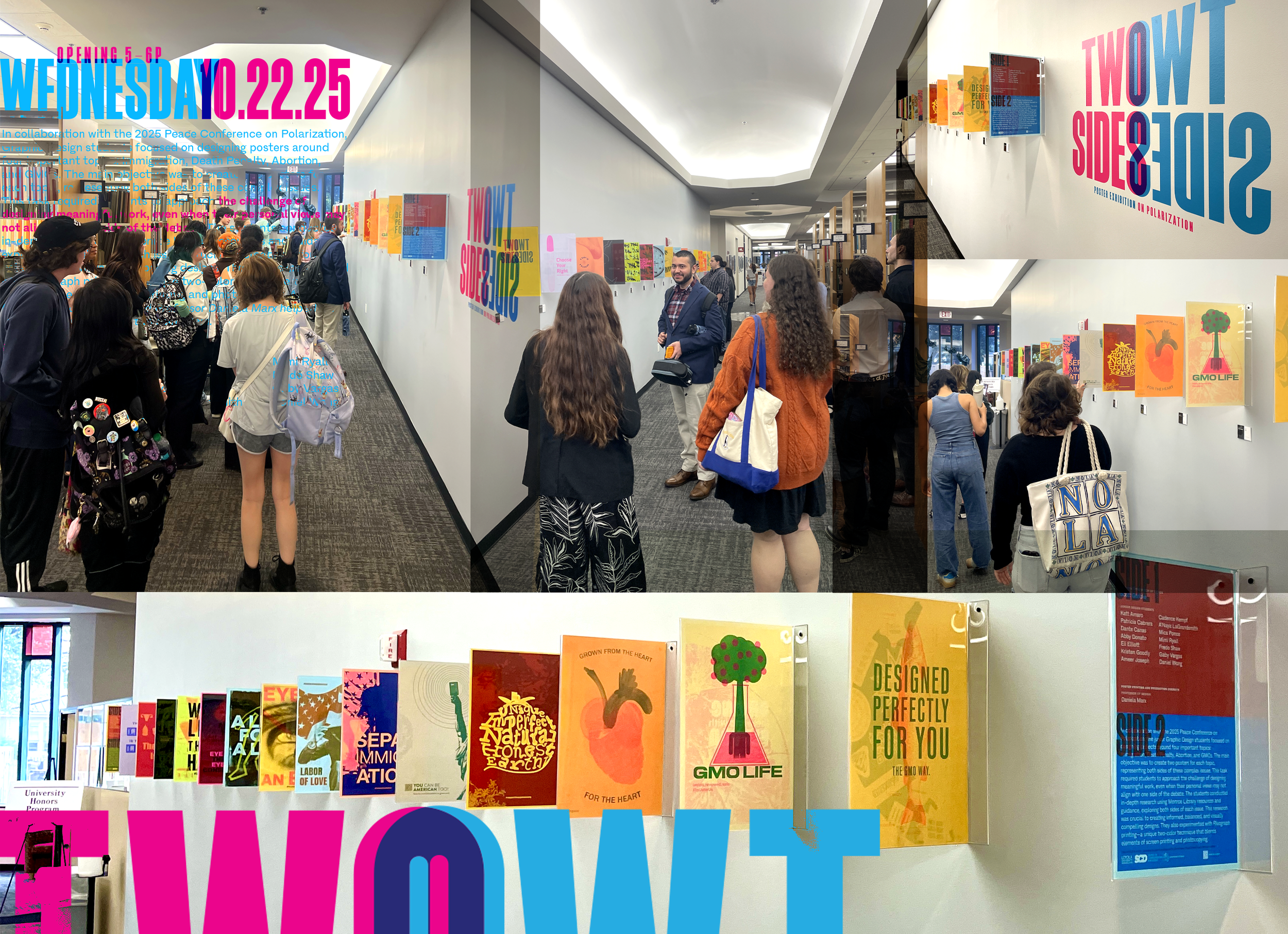 The final posters were displayed in clear acrylic frames mounted perpendicular to the wall, allowing viewers to easily see both sides. The exhibition is currently installed on Monroe Library’s first-floor gallery wall—an exhibition space I worked with the interim dean to secure for ongoing student design showcases. See the fly-through video of this unique exhibition.