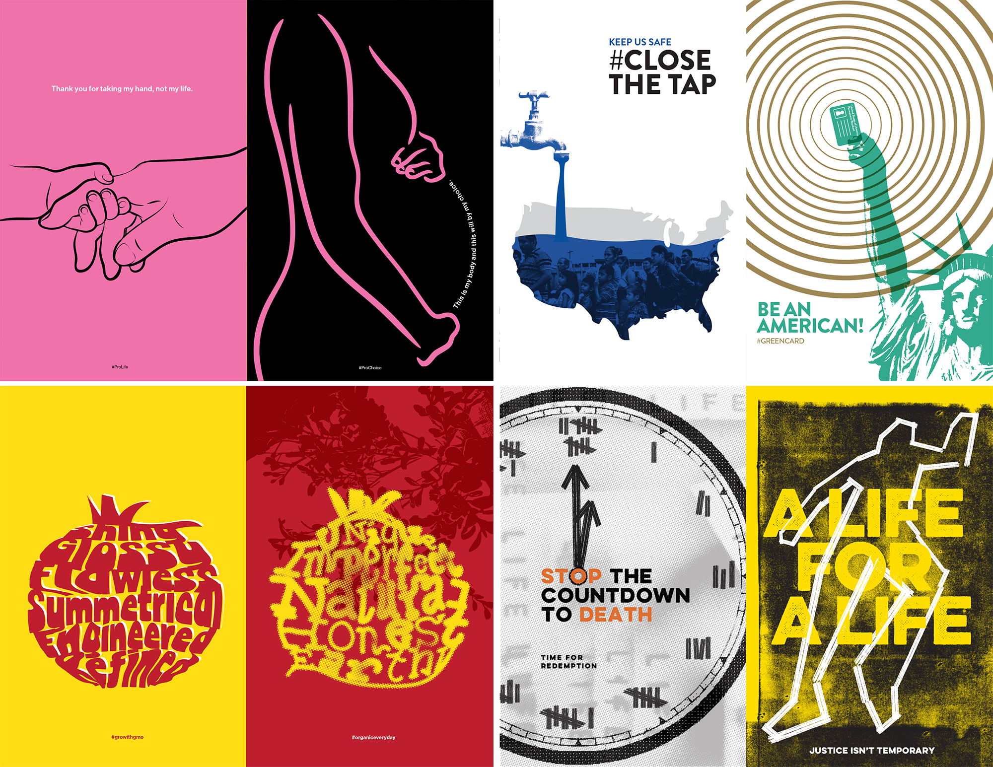 I helped curate a project initiated in my Fall 2024 Data Visualization & Presentation course. In collaboration with the 2025 Peace Conference on Polarization, junior Graphic Design students developed work around four pressing topics: Immigration, the Death Penalty, Abortion, and GMOs. The primary goal was to create two posters for each issue—one representing each side of the debate. This required students to design thoughtful, meaningful visuals even when their own perspectives did not align with one of the viewpoints.